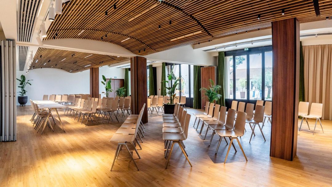 Espace modulable de la salle Masterclasse, d'une superficie de 71 m², baigné de lumière grâce à sa grande baie vitrée offrant une vue imprenable sur la Cour du Château et la nature environnante.
